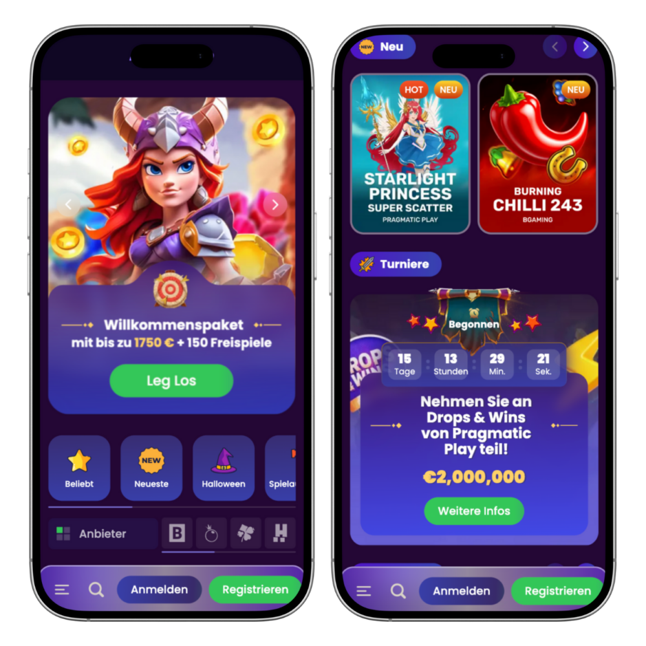 18+ | Spiele verantwortungsbewusst und maßvoll. | www.bzga.de | www.check-dein-spiel.de | 1. Einzahlung: 100% bis 500€ + 150 Freispiele | Code DISCOVER | 2. Einzahlung: 100% bis 500€ | Code EXPLORE | 3. Einzahlung: 75% bis 750€ | PURSUIT | Mindesteinzahlung: 20€ | Umsatz: 40x Bonus | 40x Gewinn aus Freispielen | Gültig: Tage | AGB gelten, 18+