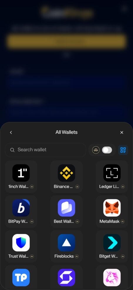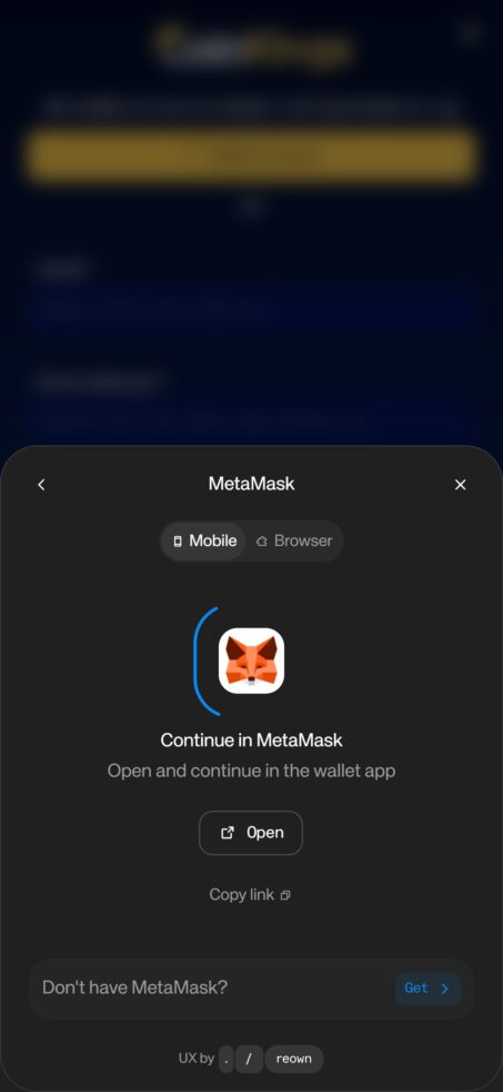 Schritt 2: Wallet verbindenScanne den angezeigten QR-Code mit deiner Krypto Wallet (z. B. MetaMask) oder wähle die Verbindung direkt über die Wallet-App aus.