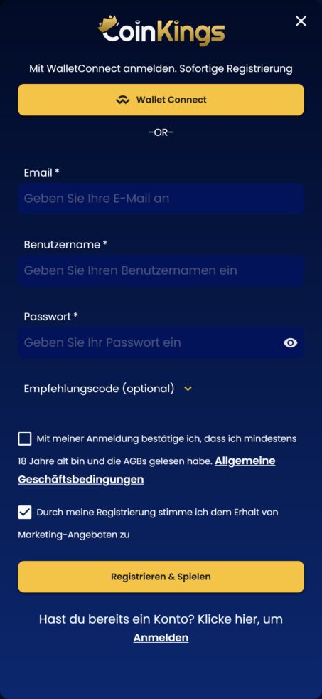 Hier erklären wir dir Schritt für Schritt, wie du dich in einem Krypto Casino wie Coinkings per Wallet Connect registrierst: