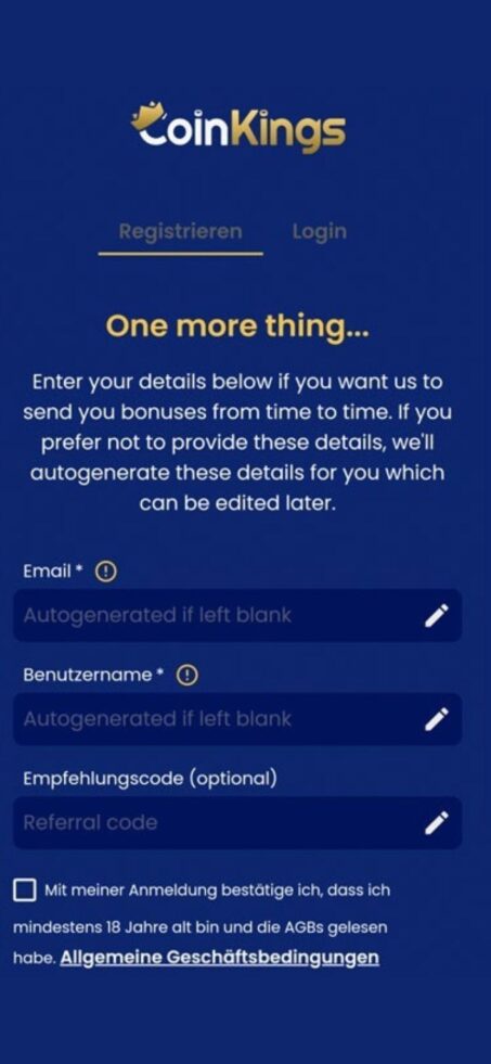 Am Beispiel von Coinkings.io lässt sich gut zeigen, wie Wallet Connect Casinos in der Praxis funktionieren. Die Verbindung zur Wallet erfolgt direkt im Browser, wobei persönliche Angaben optional sind. Für zusätzliche Sicherheit empfehlen wir dennoch, eine E-Mail-Adresse zu hinterlegen. Nach erfolgreicher Verbindung steht Wallet Connect sofort für Einzahlungen bereit.